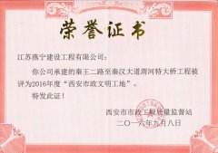 由江蘇燕寧工程科技集團有限公司參與建設的西安市秦王二橋工程喜獲2016年西安市市政文明工地稱號。西安市秦王二橋是西安渭北工業組團開發區一座重要的特大型橋梁,橋梁......