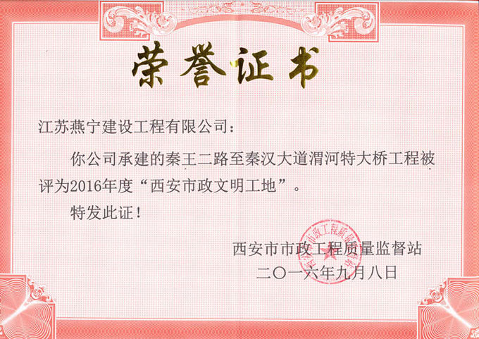 由江蘇燕寧工程科技集團有限公司參與建設的西安市秦王二橋工程喜獲2016年“西安市市政文明工地”稱號。